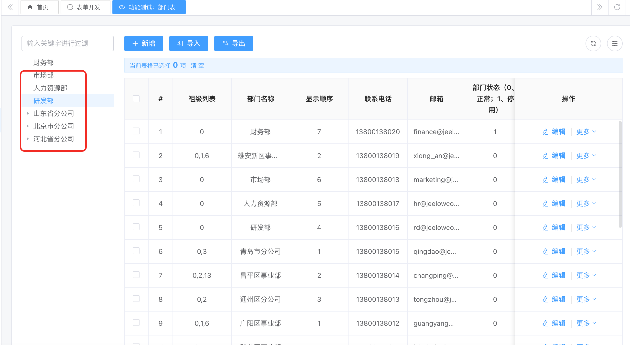 表单开发的左树右表是同一张表的数据,要不同只能源码写,具体怎么写就看你 例子只是把表单开发嵌入进去并且写明怎么交互