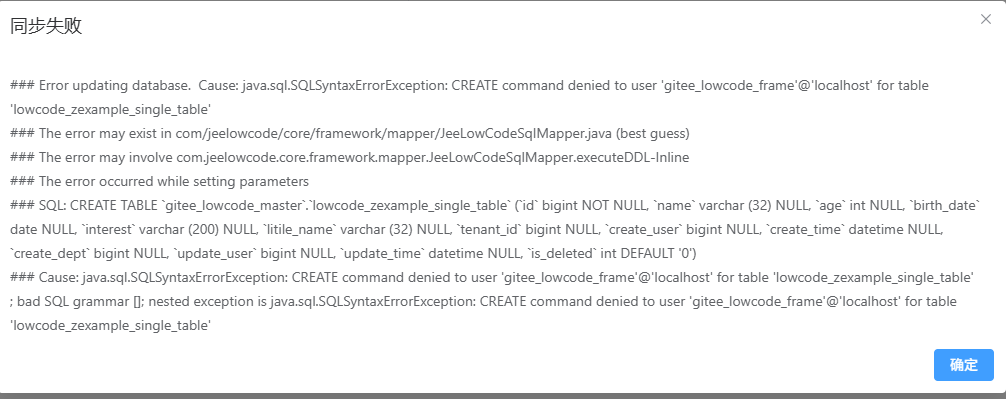 1. 在测试系统中使用lowcode_zexample_single_table示例测试,增加了一个字段litile_name,同步数据库失败: