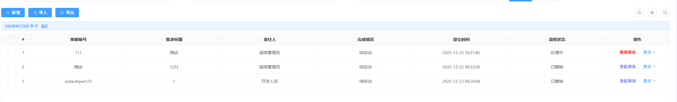 // 发起审批(操作列按钮)- 按钮编码:initiateApproval initiateApproval(row) { return new Promise(async (resolve) => { let loadingInstance = null try { // 获取详情数据 const detailData = await useFun.requestApi('post', `/jeelowcode/dbform-data/detail/${props.tableId}/${row.id}`) // 设置关联信息,给流程java增强使用 detailData.low_bpm_dbFormData = { tableId: props.tableId, dataId: detailData.id } console.log(detailData, props, "detailDatadetailData") // 调用发起流程方法,传入流程模型Id和表单数据 const result = await useImport.bpmExternal.externalStartBpm('2001900043243823105', detailData) } catch (error) { // 确保在异常时也关闭加载动画 loadingInstance?.close() console.error('发起审批异常:', error) message.error('发起审批失败') resolve(false) } }) },