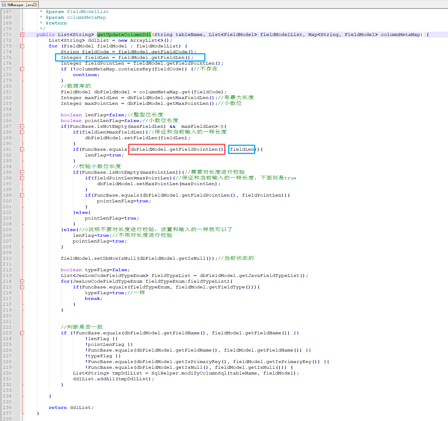 获取修改ddl列表方法getUpdateColumnDdl中,下图红色标注的地方应该用dbFieldModel.getFieldLen(),否则此方法返回的ddl列表是全部字段的,即使有些字段实际没有修改