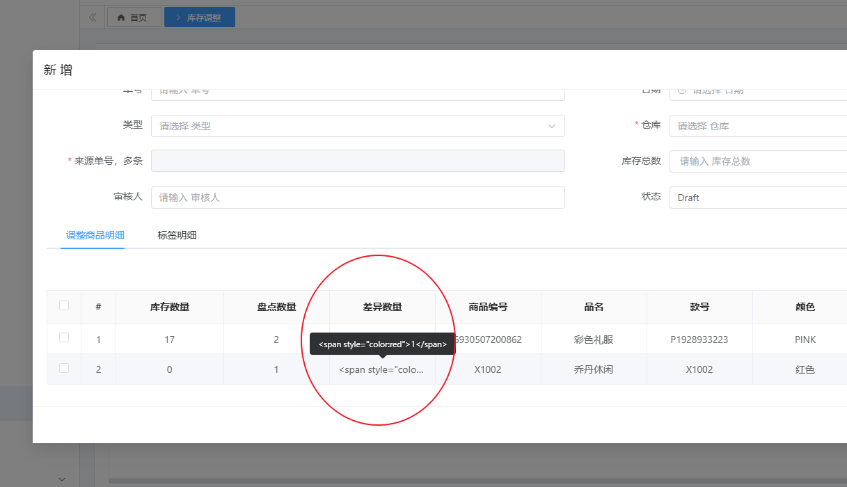 希望差异数量为不为0时, 文本变成红色,这样写,html不解析