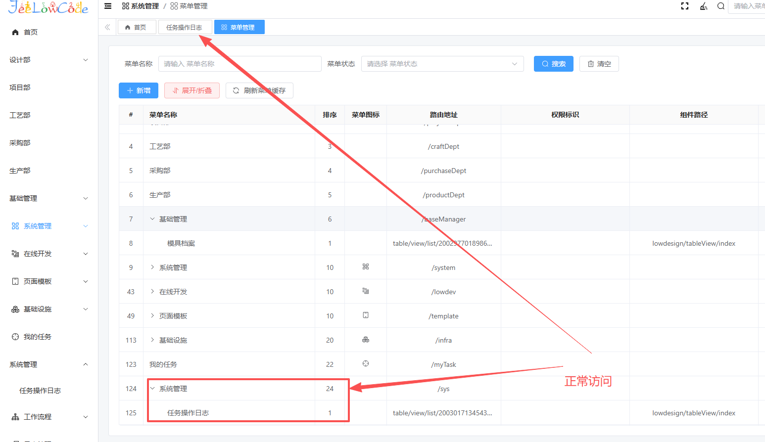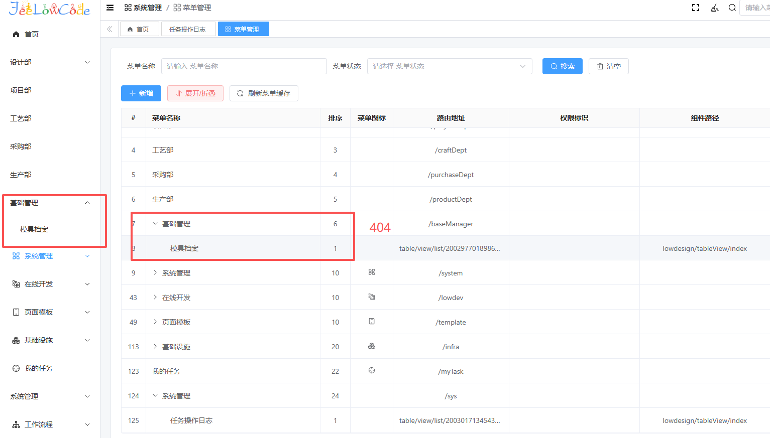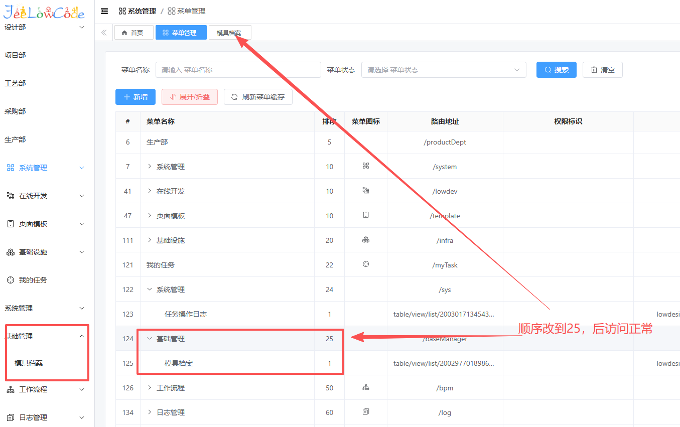 我将系统管理的顺序移到25 则系统管理下面的菜单正常访问,但是这个时候 我发现基础管理下面的菜单又404了,