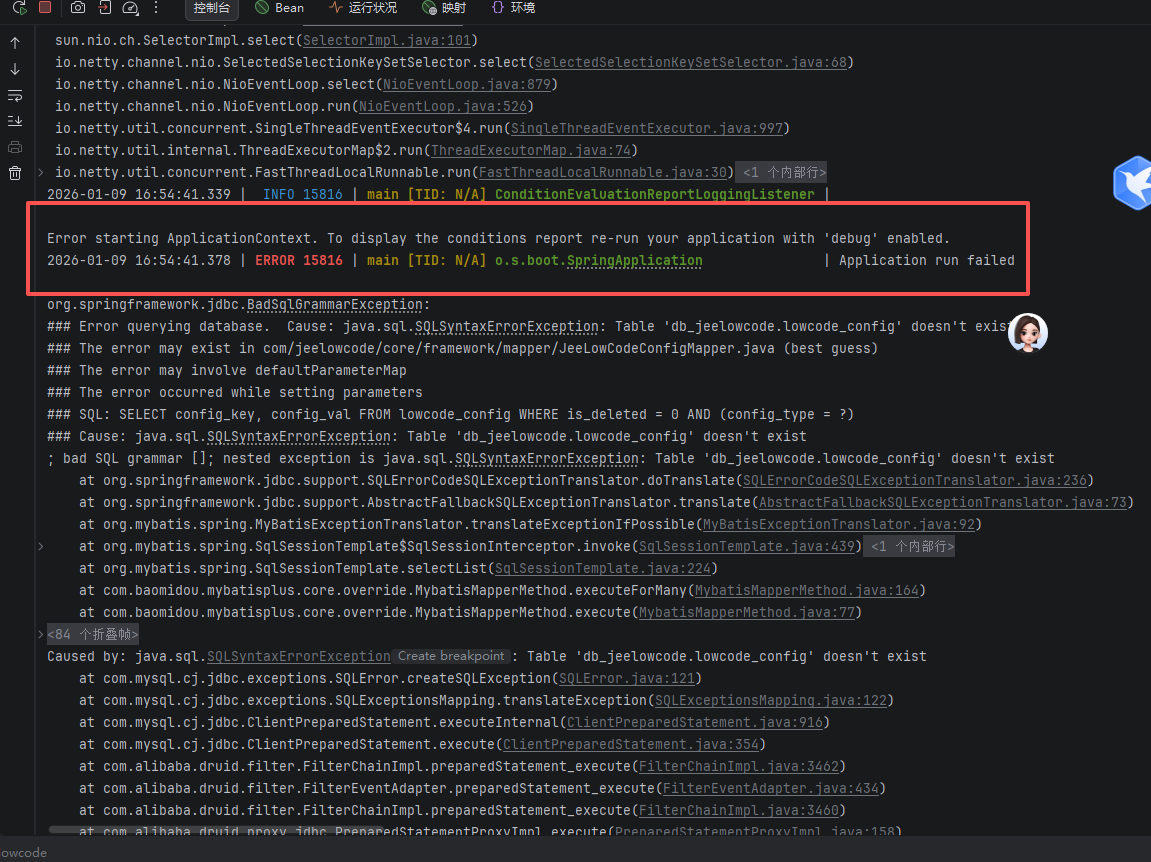 org.springframework.jdbc.### 查询数据库时出错。原因:java.sql.SQLSyntaxErrorException:表'db_jeelowcode.lowcode_config不存在### 错误可能存在于com/jeelowcode/core/framework/mapper/JeeLowCodeConfigMapper.java(最佳猜测)### 错误可能涉及defaultParameterMap### 错误发生在设置参数时