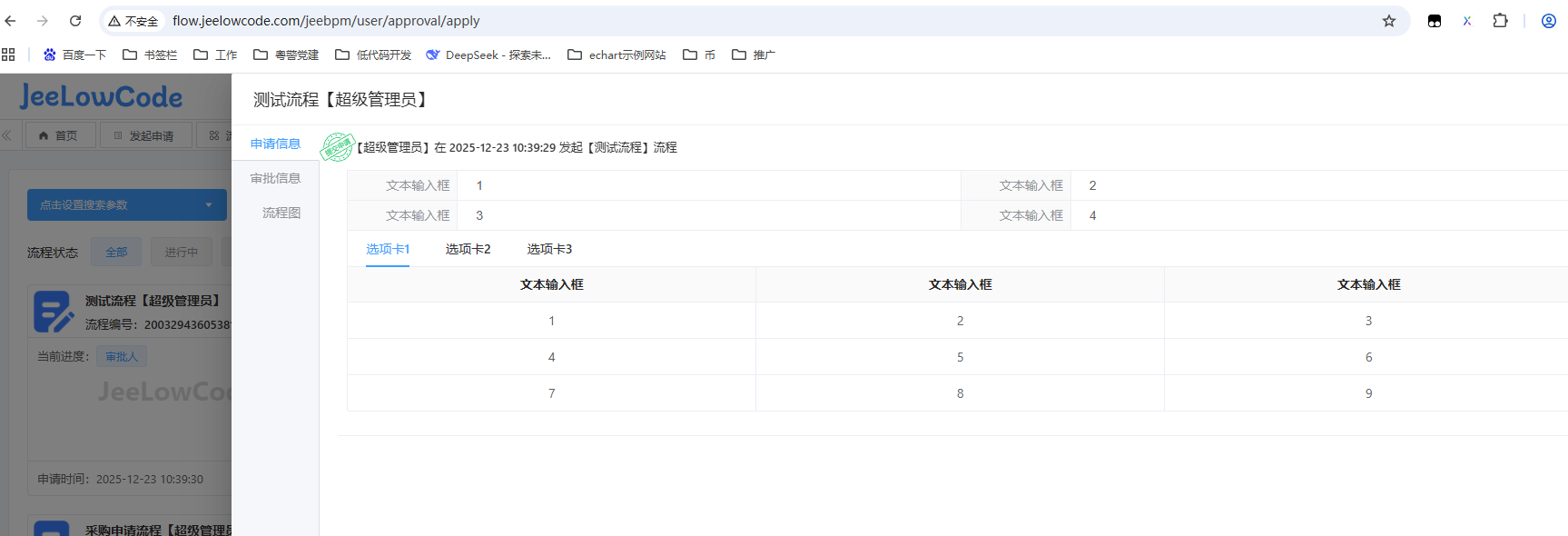 可以把自定义表单和流程导入到演示环境中,我帮你看看