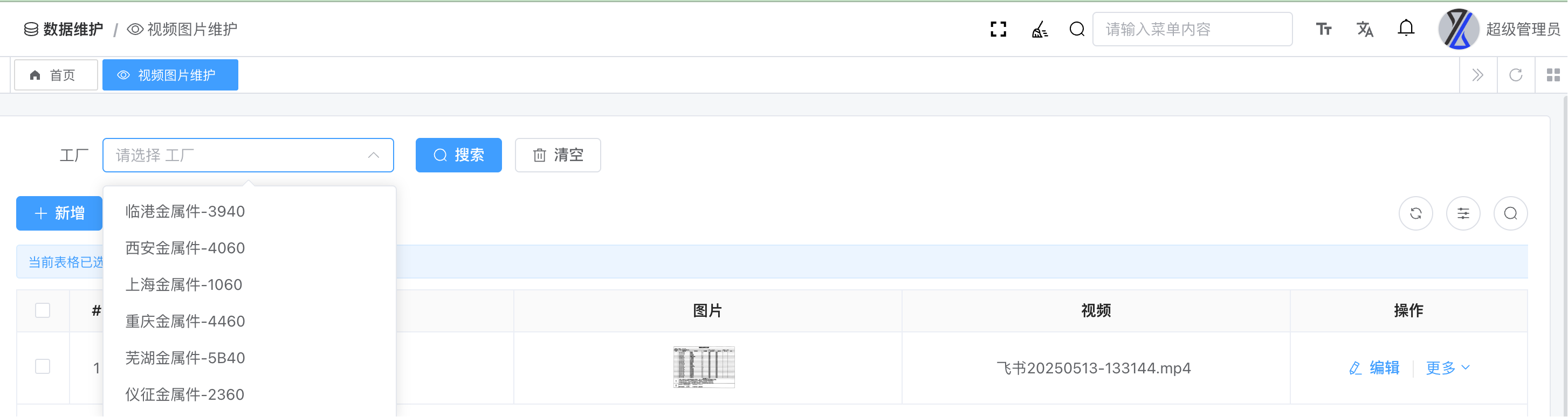先登录超级管理进去后,不做任何操作,直接切换租户,切换后,进入视频图片维护菜单,工厂字典没有