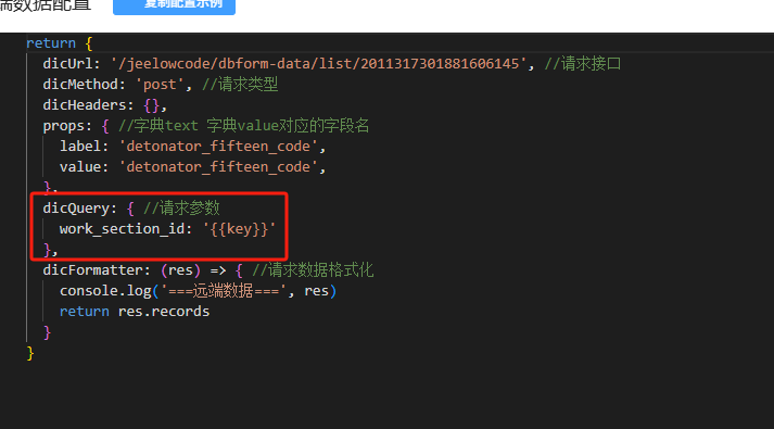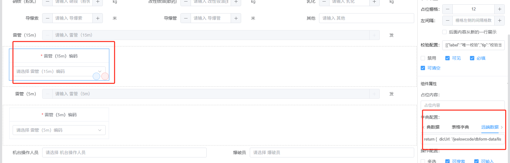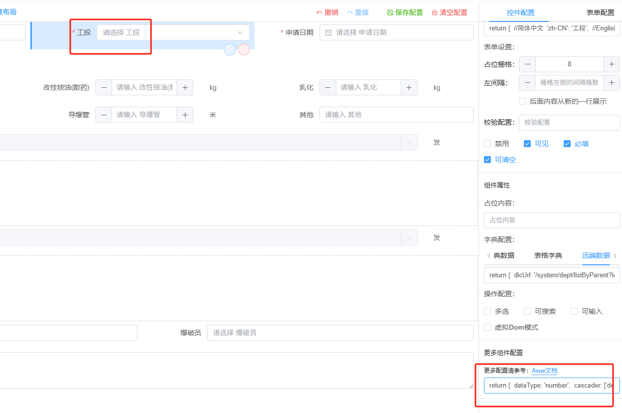 跨布局了,就不支持这样写了,通过【工段】的chang事件去修改【雷管编码】的dicQuery配置,再更新字典