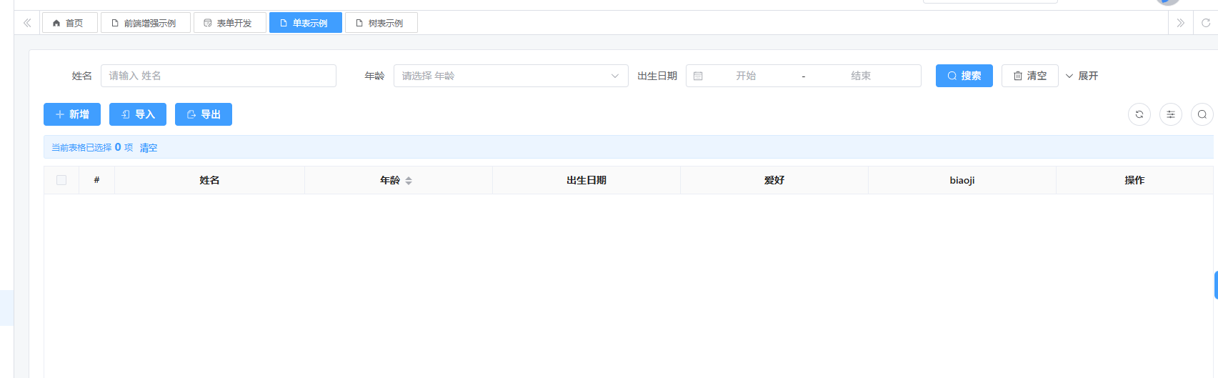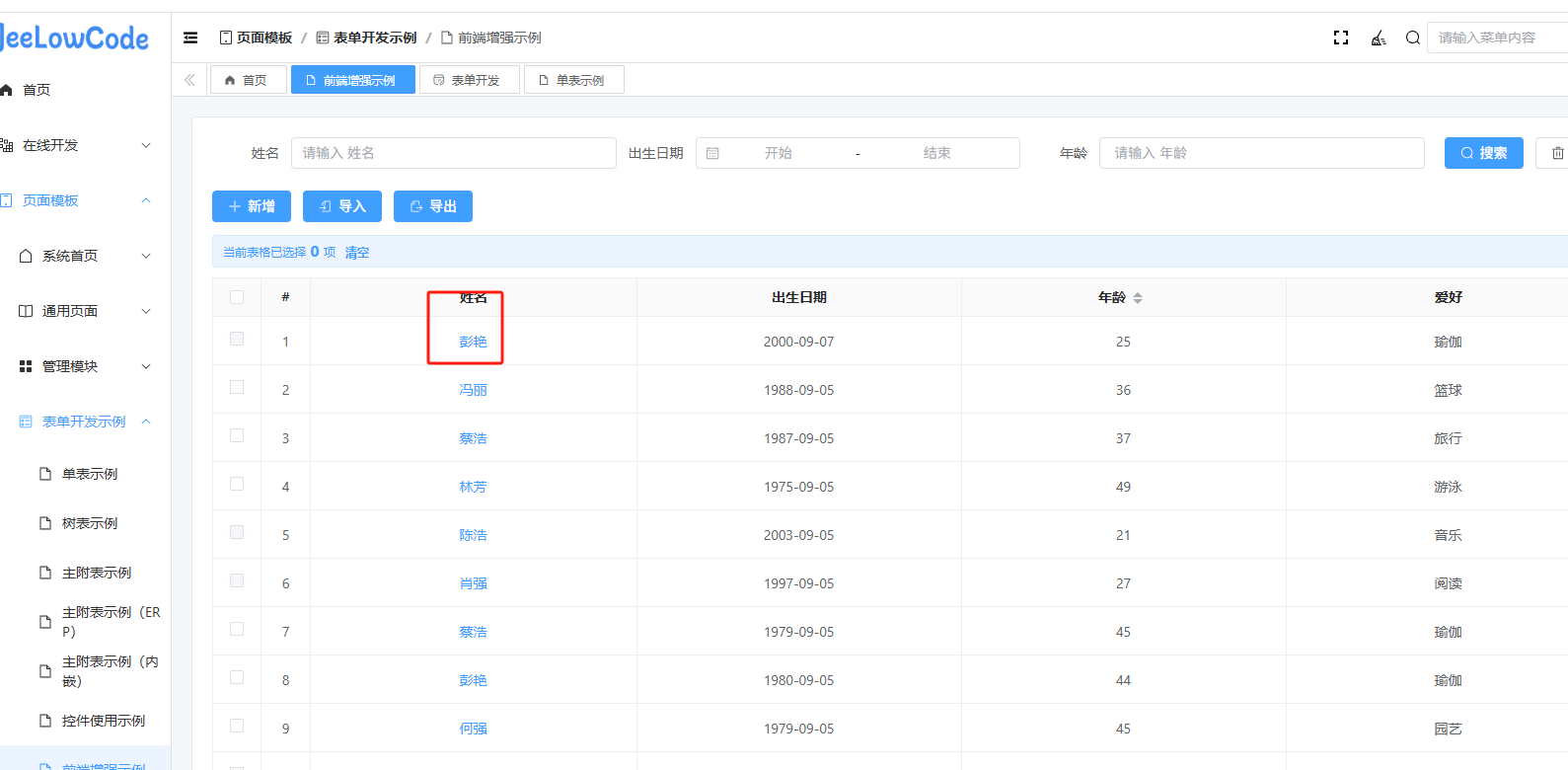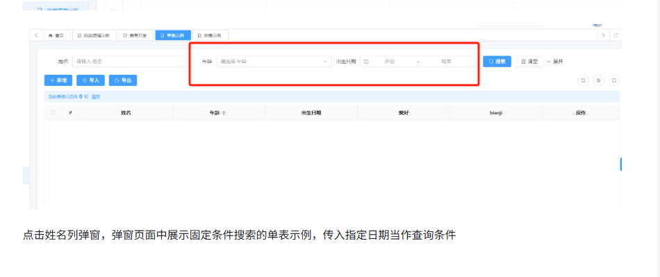 点击姓名列弹窗,弹窗页面中展示固定条件搜索的单表示例,传入指定日期当作查询条件