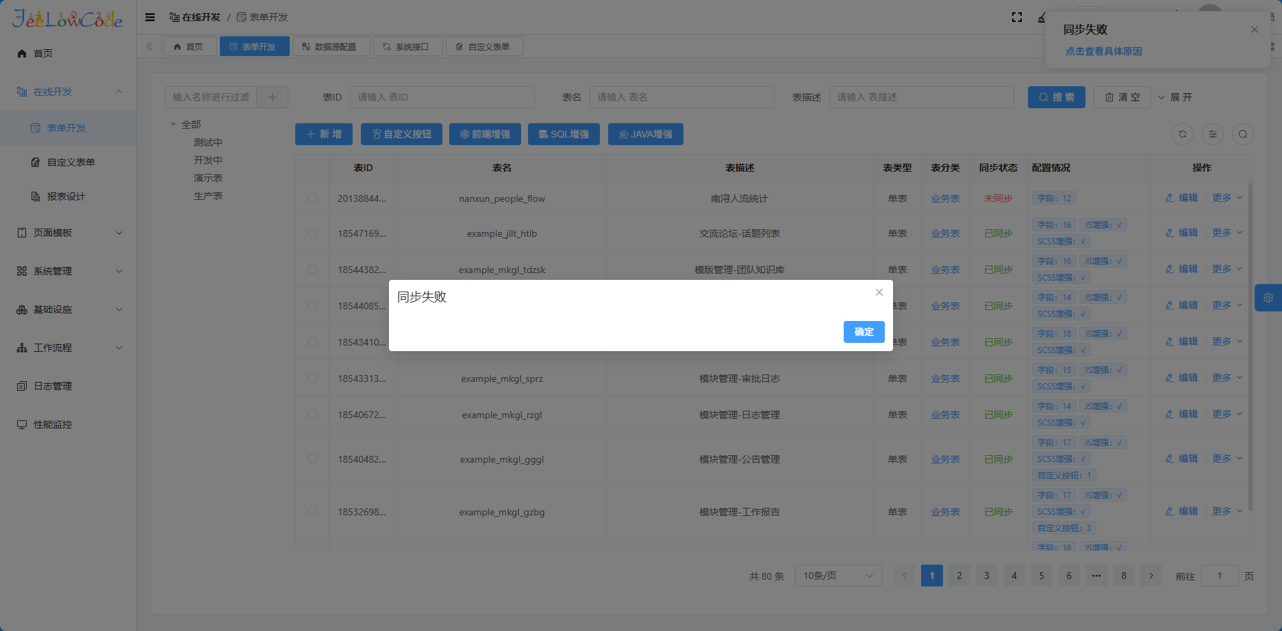 表单开发中,无法选择数据库表,填写完字段后同步数据库时报错