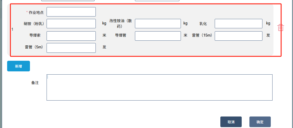 点击新增按钮后,红框下方在增加红框内容进行填报
