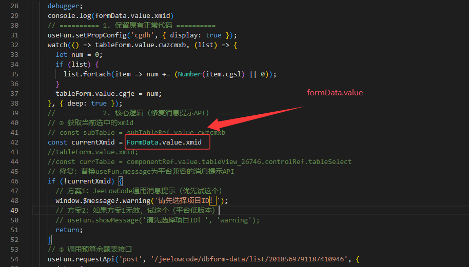 首先是没有取到主表单xmid的值: const currentXmid = FormData.value.xmid