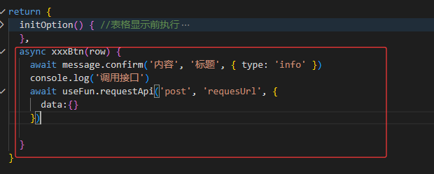 你好,我新增一个自定义按钮,我点击后直接请求后端接口修改数据的状态,现在我怕用于误点,我想加个提示框,比如你确定删除之类的,如下图,我点击“确定”按钮,我就直接请求后端地址,根据id进行修改状态。我要怎么实现??