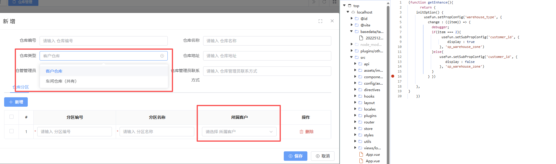 请教老师,如图,我仓库是主表,分区是附表,一对多,我想根据主表的"仓库类型"来控制附表的“所属客户”,如果仓库类型是客户仓库,则所属客户是必须选择的,如果是车间仓库,则不可选择且要清空的,我使用setSubPropConfig设置不起效果。我要怎么修改?
