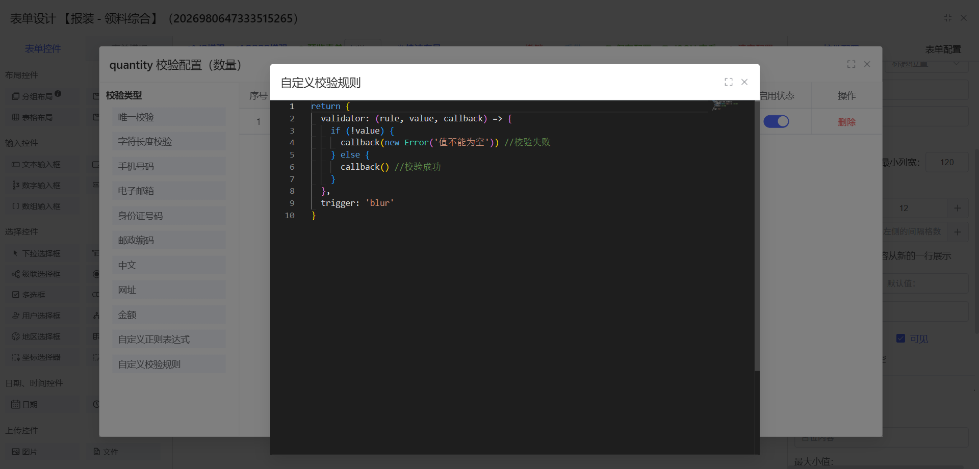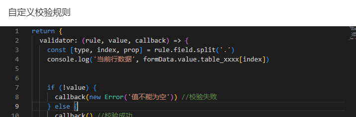 在自定义表单中使用表格布局,想要给某一列单独增加自定义校验规则,如何在检验的时候拿到这一行的数据呢