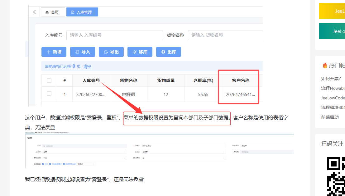 这个用户,数据过滤权限是“需登录、鉴权”,菜单的数据权限设置为查询本部门及子部门数据。客户名称是使用的表格字典,无法反显