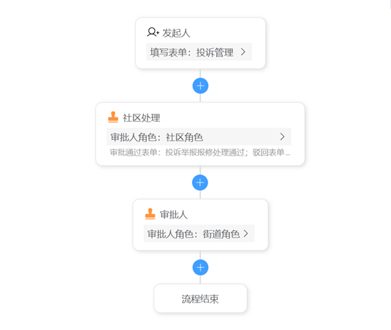 我这设计一个投诉流程,想物业管理平台一样,业主发起投诉,投诉完有人处理,最后实际处理人要填写一个处理意见
