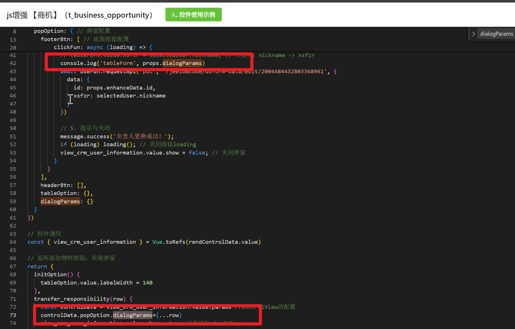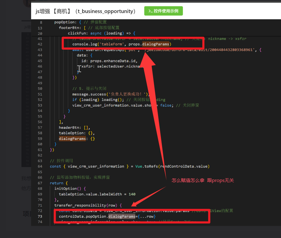 我想往开发的表单的弹窗里面传选择的行数据,上面的row有数据,但是点击确定后通过props.dialogParams拿不到,有其他方法吗