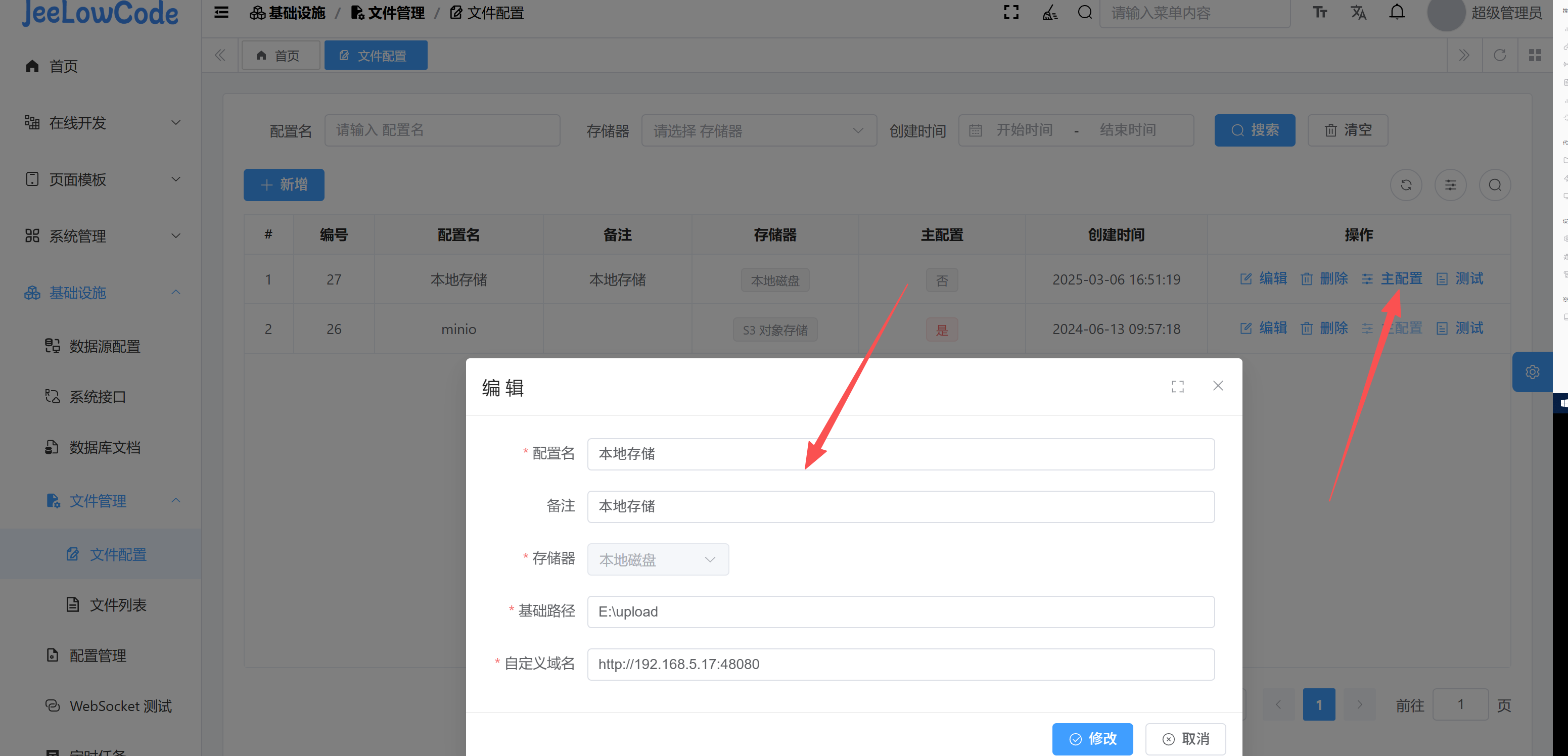 因为项目部署在NAS上,想充分利用NAS的存储阵列而不是再单独开一个盘给MinIO,所以在前后端部署完成后,在基础设施-文件配置里面新增了一个本地磁盘的配置,指向目录/vol1/jee_files,自定义域名设置成了网站域名:端口号,后面没加东西。点击测试成功,目录下能看到自动上传的图片,手动传自己的图片也能成功,在jee_files下能看到相应日期的文件夹,进去也能看到文件。