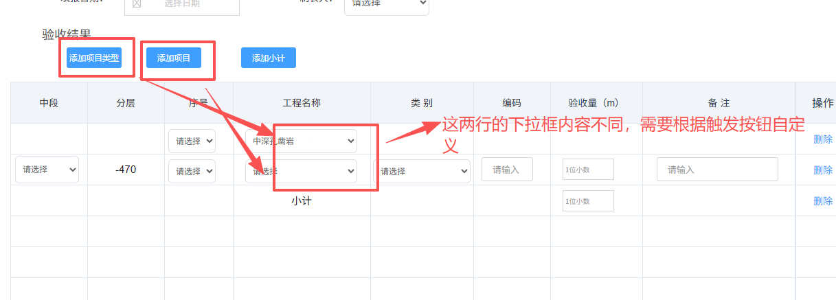 一个主子表模块,子表自定义了两个外部按钮(比如:添加类型1,添加类型2),用于动态向子表中增加行,有一个属性是下拉选择框,比如:项目类型,我需要根据不同添加按钮动态更新这个下拉选择框,如:通过“添加类型1” 新增的行,这个属性的下拉框是与类型1有关的,而“添加类型1”新增的行,则是类型2有关的,都需要重新通过requestApi查询。