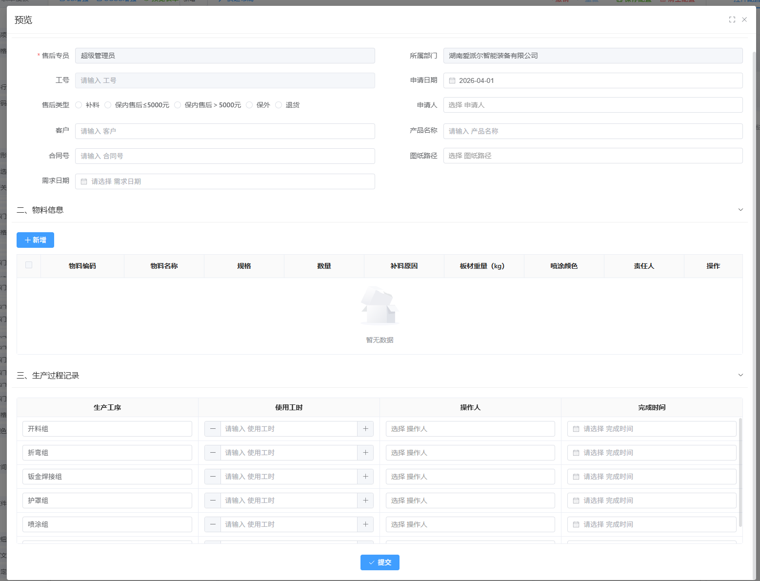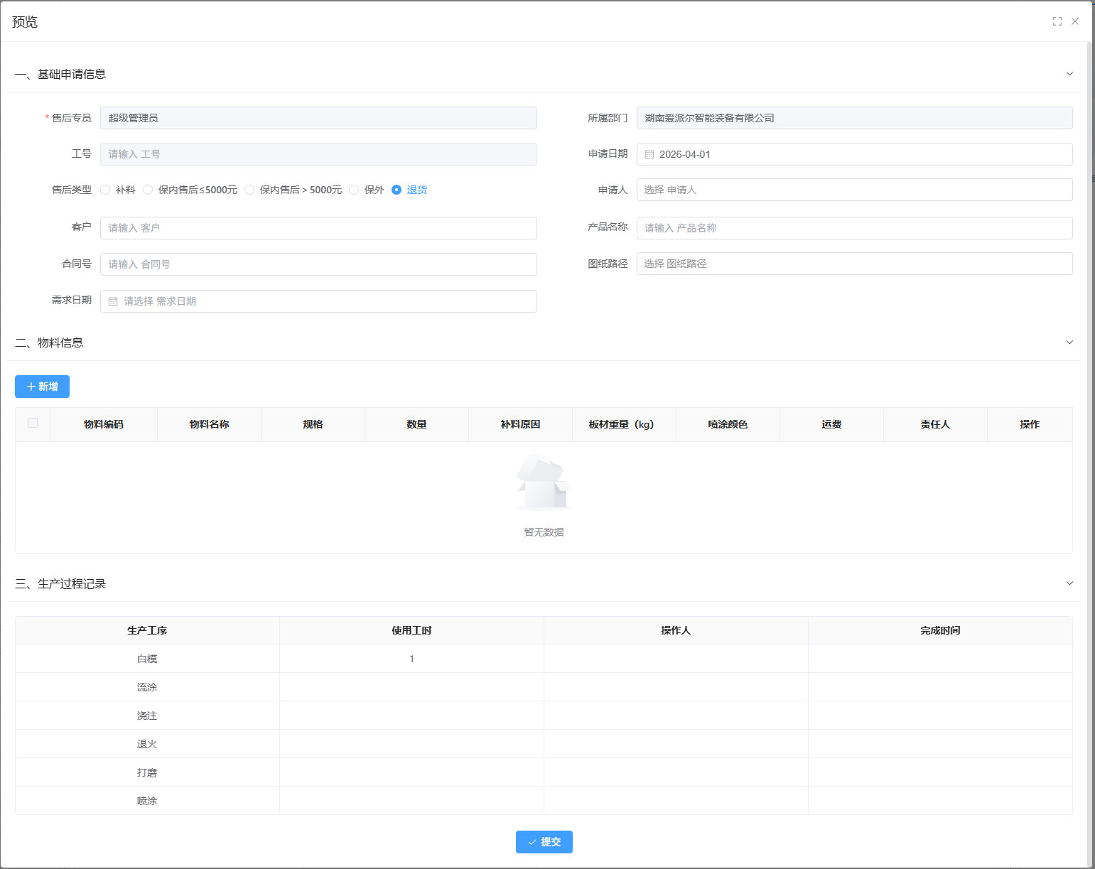 默认打开的时候下面的生产过程记录的输入框还在,但是我把售后类型切换成退货,下面的生产过程记录的输入框就不在了
