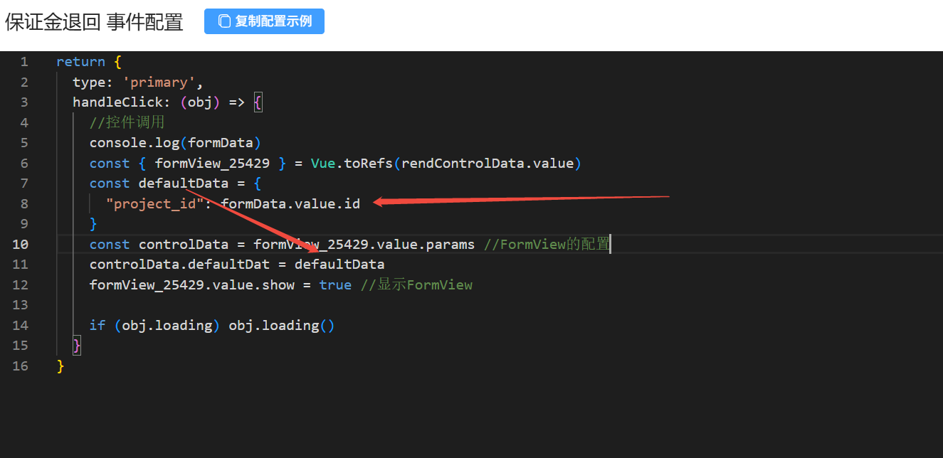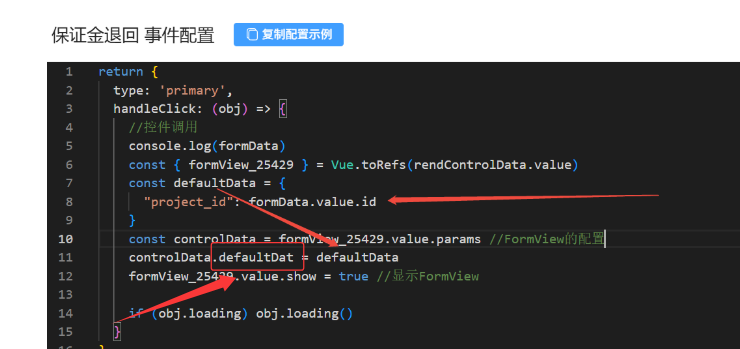 按钮组事件配置,想把 form表单中的id值自动存到打开的表单中作为 project_id的值,这种写法为何无效