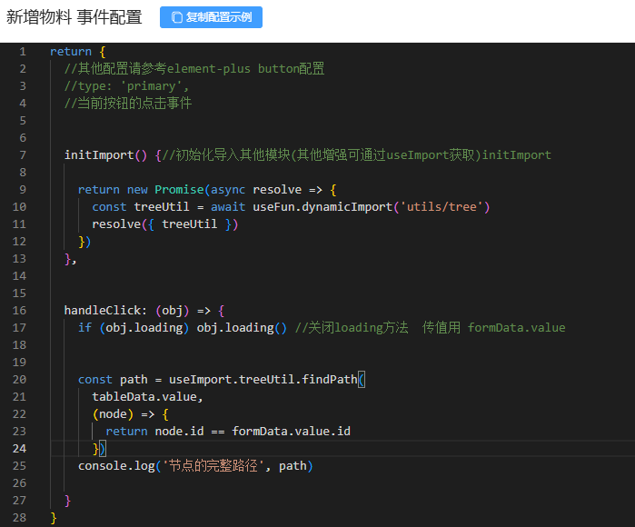 物料分类详情表是自定义表单,在自定义表单上面的新增物料按钮代码没有生效,点击事件代码如下: